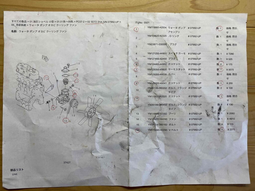 新品のウォーターポンプ、車用なら1万円前後でも、ユンボ用は5万円台・・・高いですね。