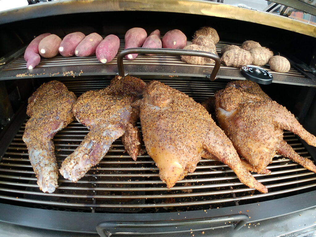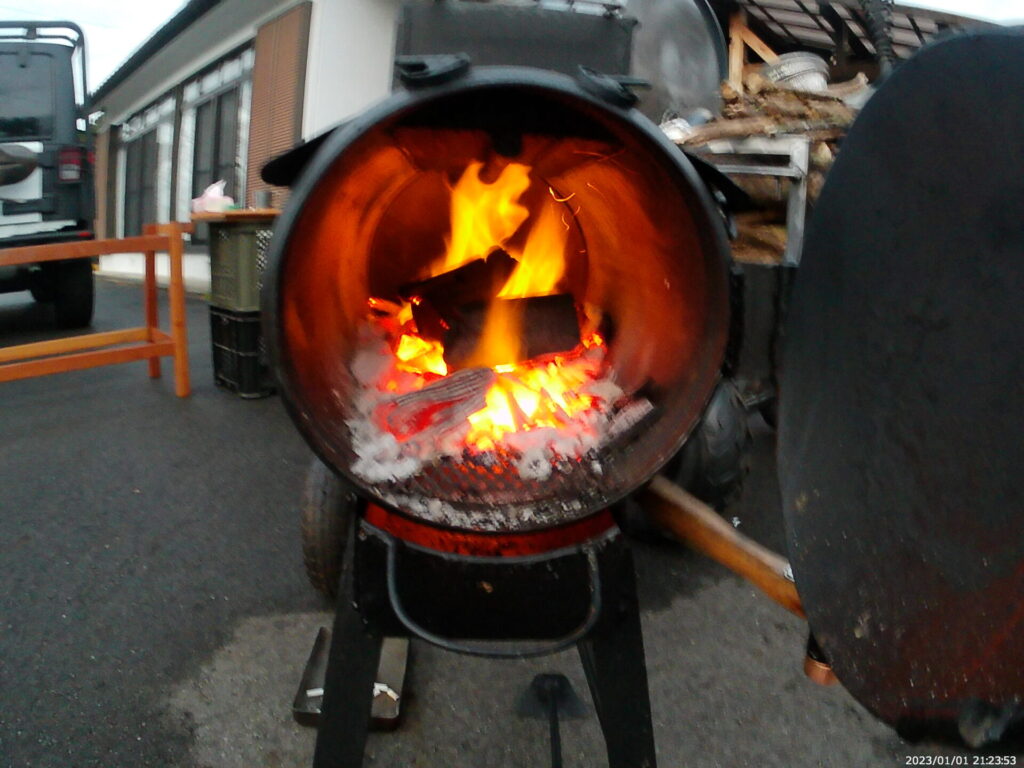 豚コンロからの熱と煙でスモークする仕組みです。