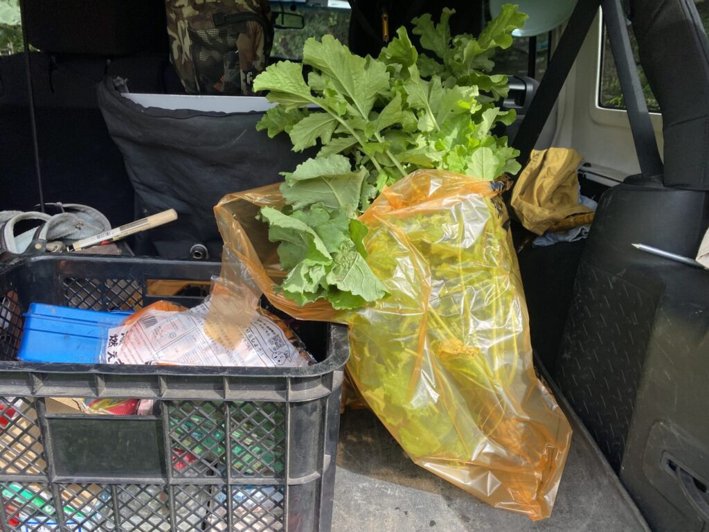 無肥料栽培なので長い時間をかけて育ってしまうので、野生の大根みたいになりましたが、持ち帰って葉っぱは漬物にしました。大根は硬いので、煮込んで豚汁にしました。