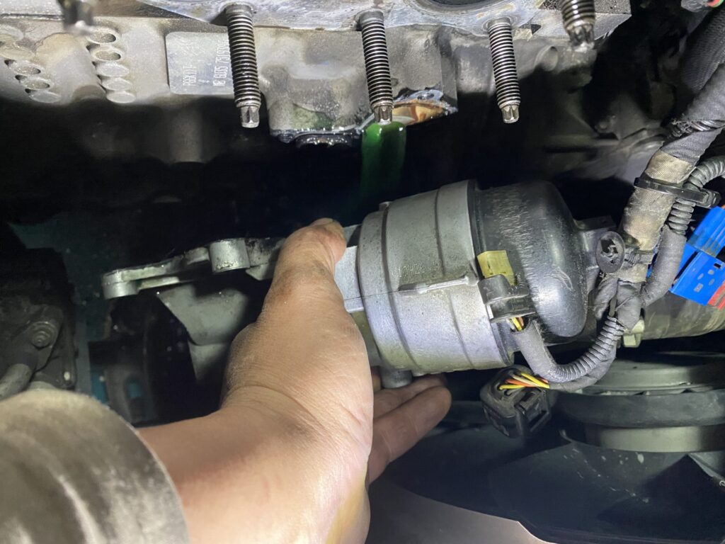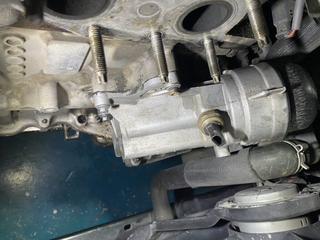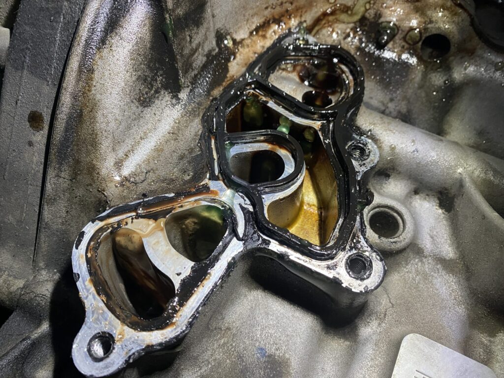 オイルと冷却水が地面に溜まるほど漏れて、冷却水が減りオーバーヒートの危険性があるので、急遽パッキンの交換をしました。