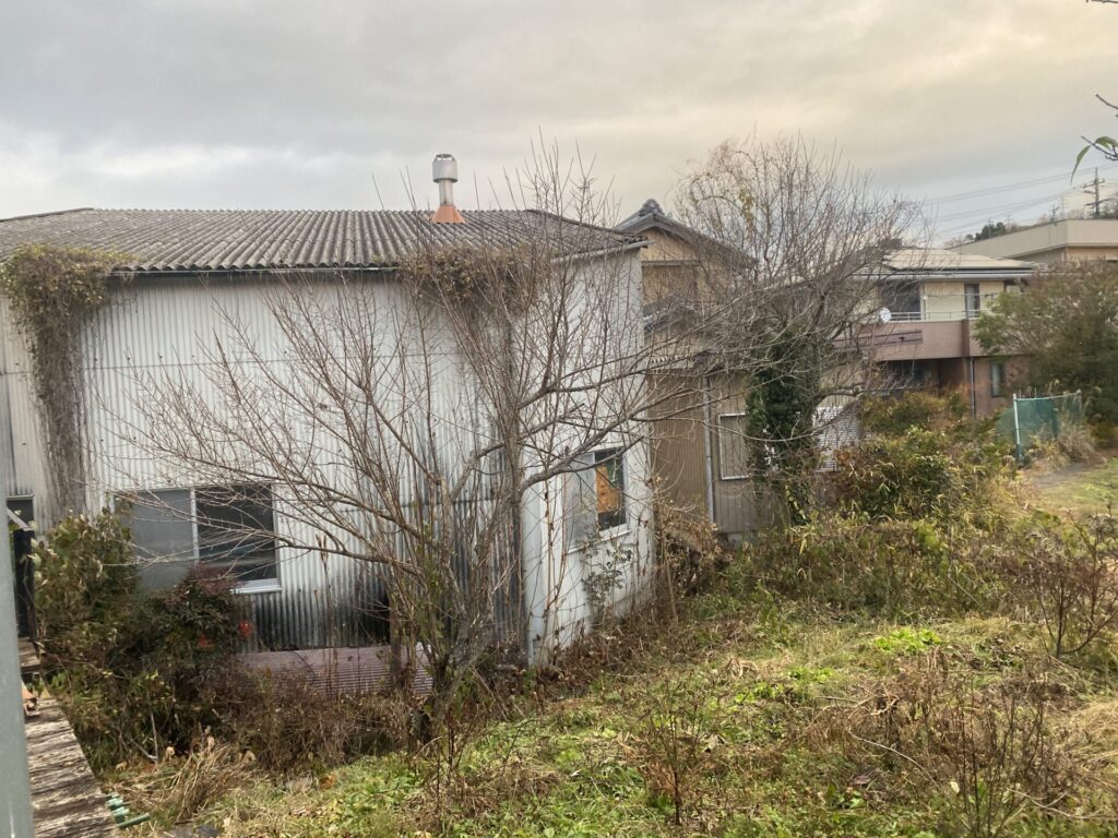 真ん中の緑色の木は、自宅のウッドデッキの下に種が飛んできたのか?日陰で自生していたので、数年前に土手に移植しました。